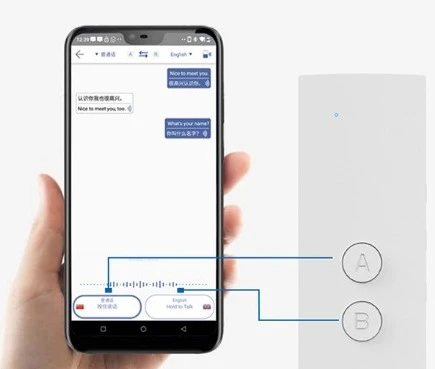 - Bluetooth. Nainstalujte aplikaci do mobilního telefonu (kompatibilní s IOS a Android) a poté propojte zařízení s mobilním telefonem Bluetooth a spusťte překlad v reálném čase.