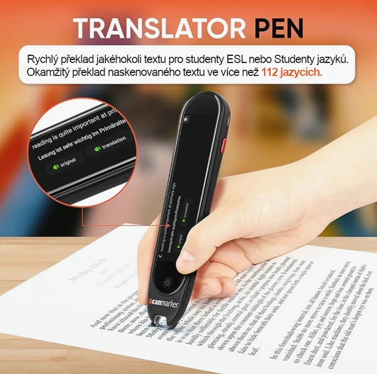 - Scanmarker Reader skenuje a překládá do více než 100 jazyků. Zobrazuje originální i přeložený text, takže je vhodným nástrojem pro studenty jazyků. K pochopení materiálu a zlepšení porozumění čtenému textu můžete využít integrované SLOVNIKY . Obsahuje také funkce SPEECH-TO-TEXT.
